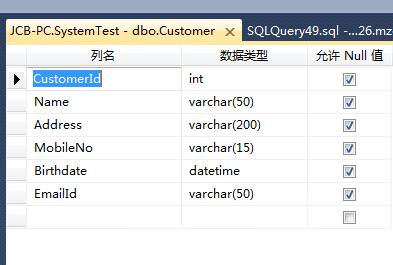在数据库中创建一张数据表,表名为Customer,见下图: