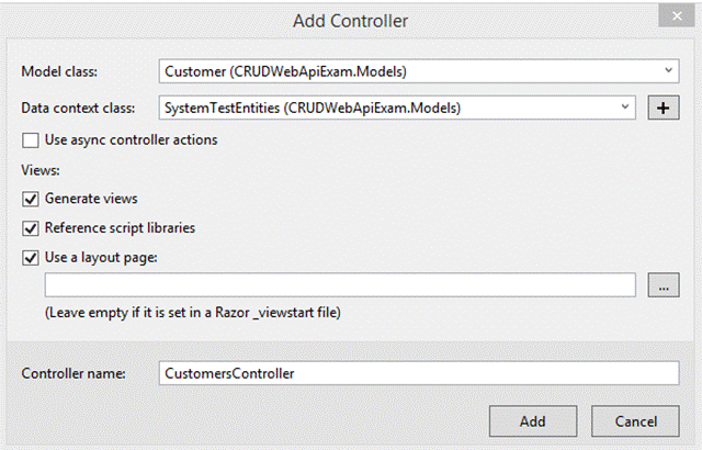 设置控制器名称为CustomersController,点击'添加'。 上述操作完成后,CustomerController.cs会自动生成。