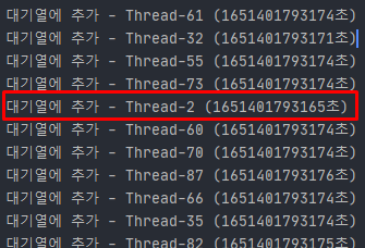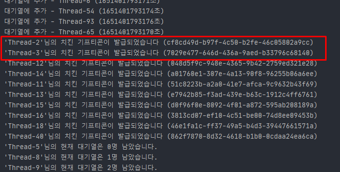 가장 빨리 참여한 "Thread-2", "Thread-3"가 치킨 기프티콘을 먼저 받는 것을 확인할 수 있다.