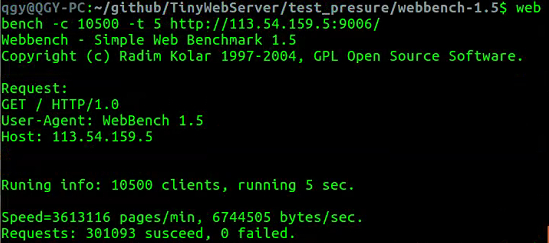 注意: 使用本项目的webbench进行压测时,若报错显示webbench命令找不到,将可执行文件webbench删除后,重新编译即可。