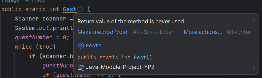 Зачем делать возвращаемый тип у метода int, если ты его не используешь? Для таких целей есть void