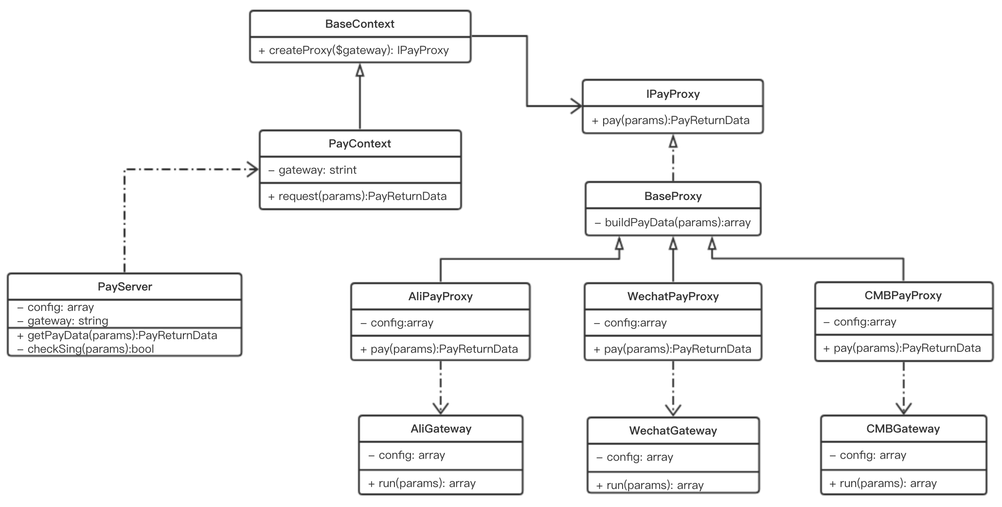 通过上面的操作变化已经基本上被完全封装了。如果新增一个支付渠道。只需要增加:XXXGateway 与 XXXProxy。