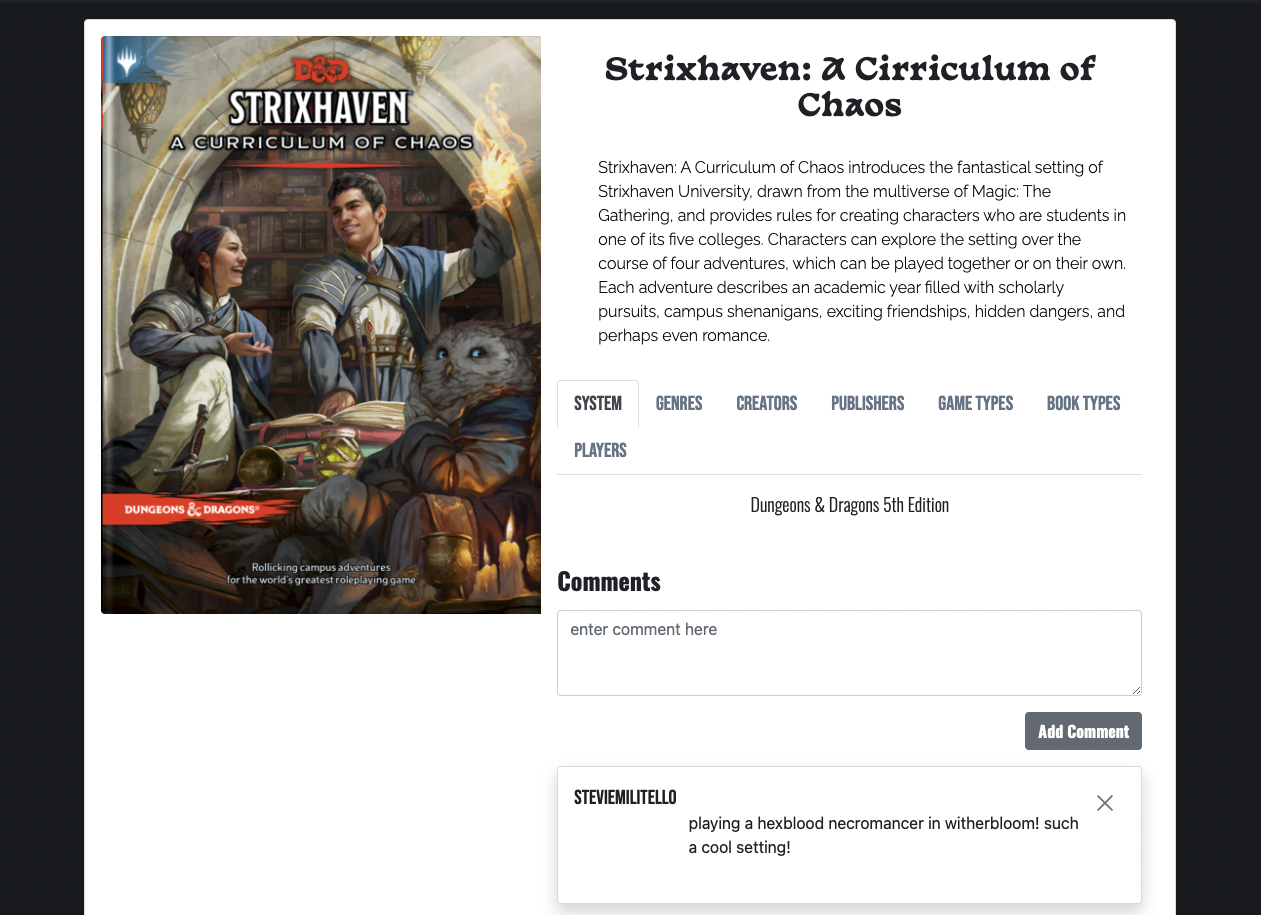 TTRPG Tracker is an app to keep track of your tabletop RPG book collection. As a user you can view books, add books to your collection, remove books from your collection, add new books to your collection, edit and delete books in your collection, sort the books, and add and delete comments on a book's page.