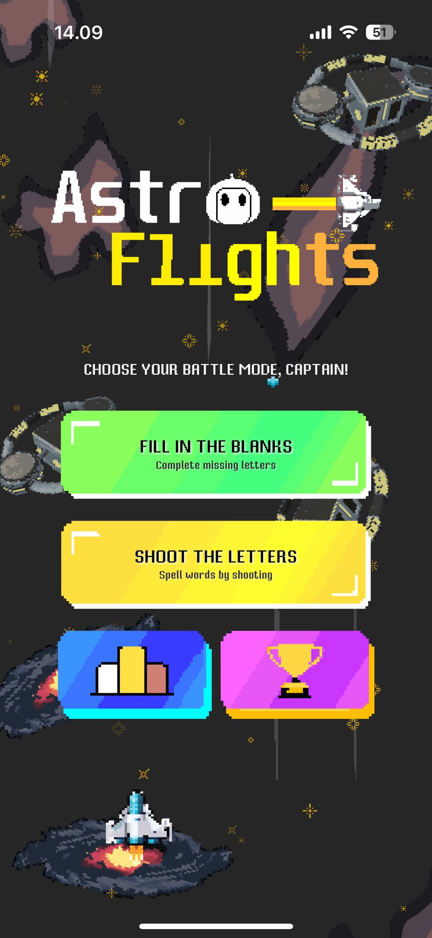 Welcome to Astro Flights, a fast-paced, hypercasual retro arcade game for iOS where your vocabulary is your greatest weapon. Built entirely with modern Swift technologies, this game challenges players to type falling words to clear them before they overwhelm the screen. The project is a demonstration of a hybrid UI approach, seamlessly blending the power of SpriteKit for dynamic gameplay with the declarative elegance of SwiftUI for the user interface and state management.