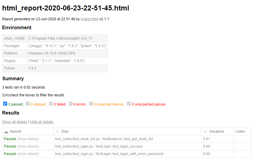 E:\PycharmProjects\order-api-test>walnuts run ========================================================================================================= test session starts ========================================================================================================= platform win32 -- Python 3.8.2, pytest-5.4.3, py-1.8.2, pluggy-0.13.1 rootdir: E:\PycharmProjects\order-api-test plugins: html-2.1.1, metadata-1.9.0 collected 3 items test_suites\test_book_list.py . [ 33%] test_suites\test_login.py .. [100%] ========================================================================================================== warnings summary =========================================================================================================== c:\users\administrator\appdata\local\programs\python\python38\lib\site-packages\_pytest\junitxml.py:417 c:\users\administrator\appdata\local\programs\python\python38\lib\site-packages\_pytest\junitxml.py:417: PytestDeprecationWarning: The 'junit_family' default value will change to 'xunit2' in pytest 6.0. Add 'junit_family=xunit1' to your pytest.ini file to keep the current format in future versions of pytest and silence this warning. _issue_warning_captured(deprecated.JUNIT_XML_DEFAULT_FAMILY, config.hook, 2) -- Docs: https://docs.pytest.org/en/latest/warnings.html ------------------------------------------------------------------ generated xml file: E:\PycharmProjects\order-api-test\report\junit_report-2020年06月23日-22-51-45.xml ------------------------------------------------------------------ -------------------------------------------------------------- generated html file: file://E:\PycharmProjects\order-api-test\report\html_report-2020年06月23日-22-51-45.html -------------------------------------------------------------- ==================================================================================================== 3 passed, 1 warning in 0.92s ===================================================================================================== 邮件发送成功,请查收