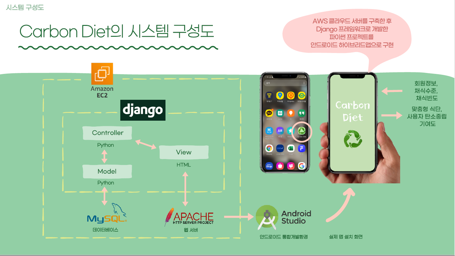 해당 프로젝트는 파일 목록 메인에 있는 'carbon_diet_app.apk' 파일을 통해 안드로이드 휴대폰에 설치하여 결과물을 바로 확인하실 수 있습니다.
