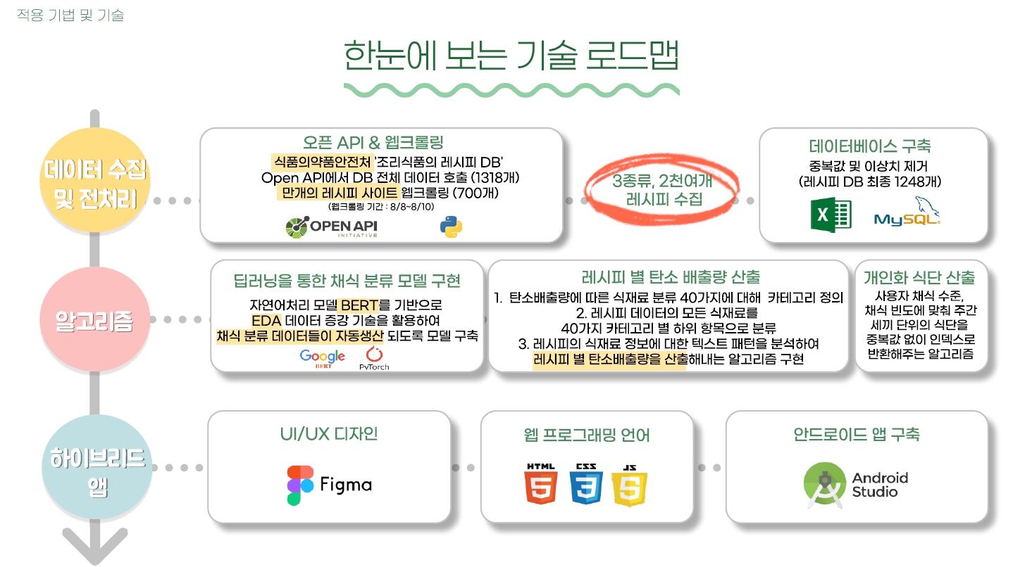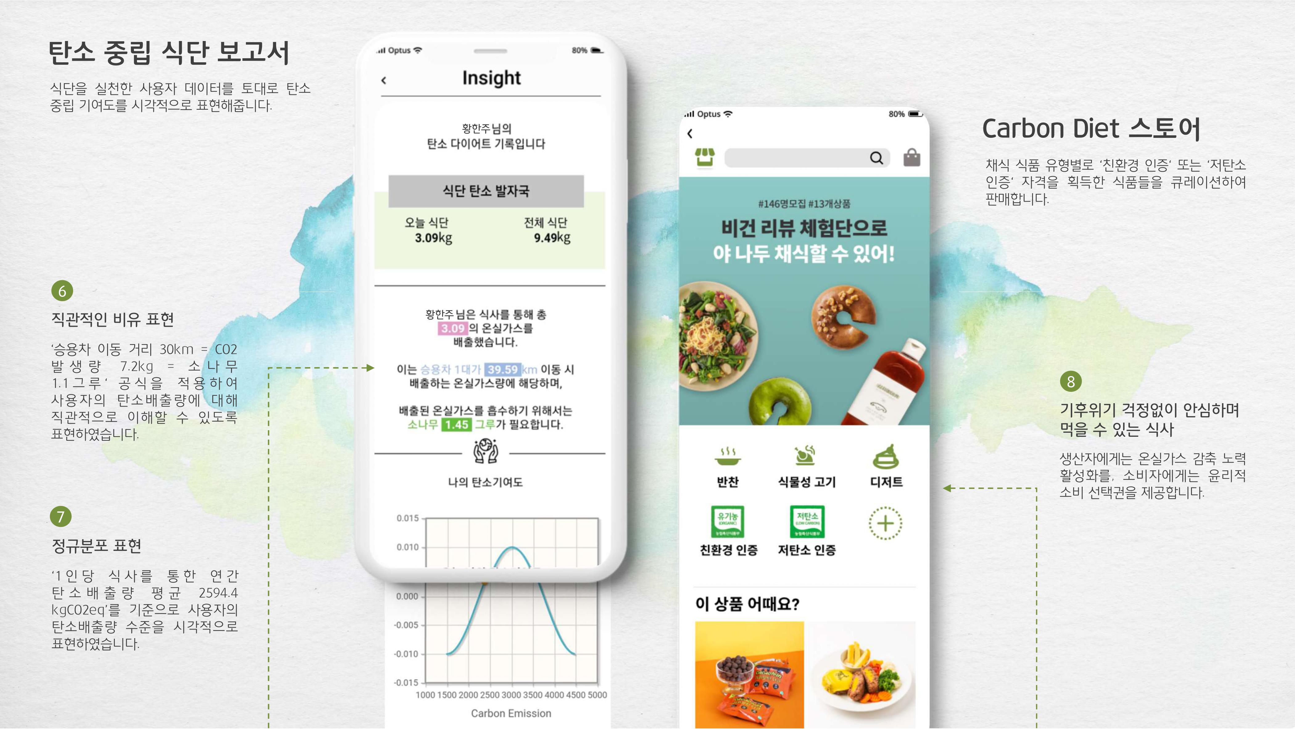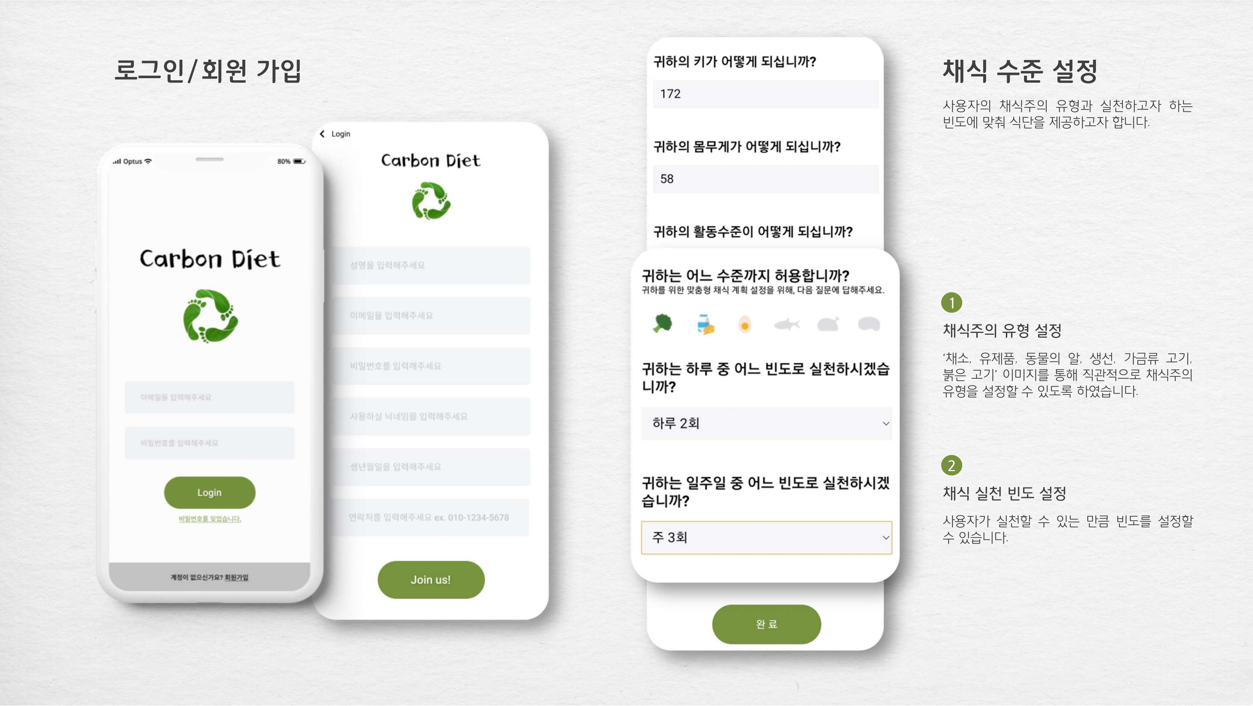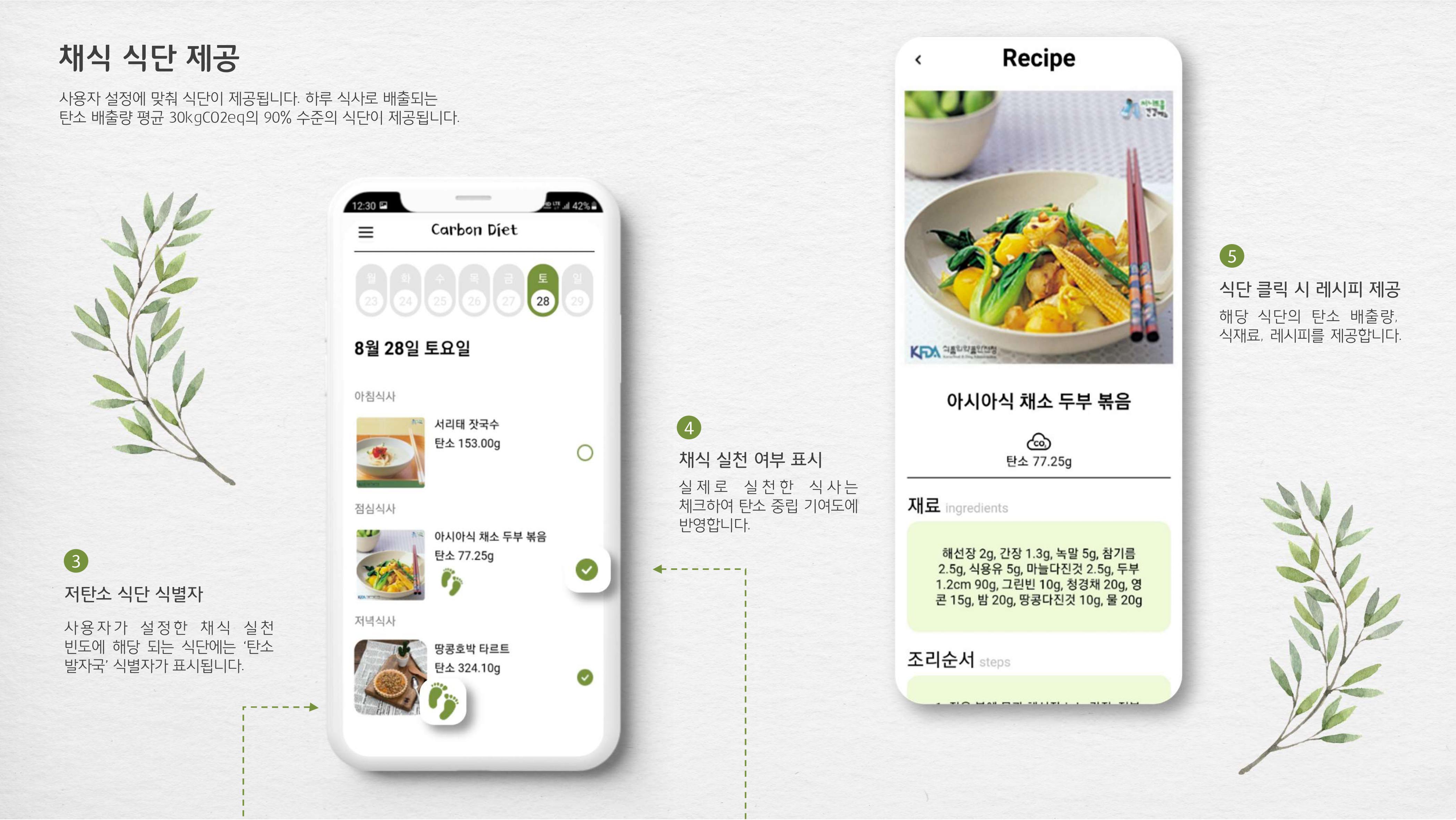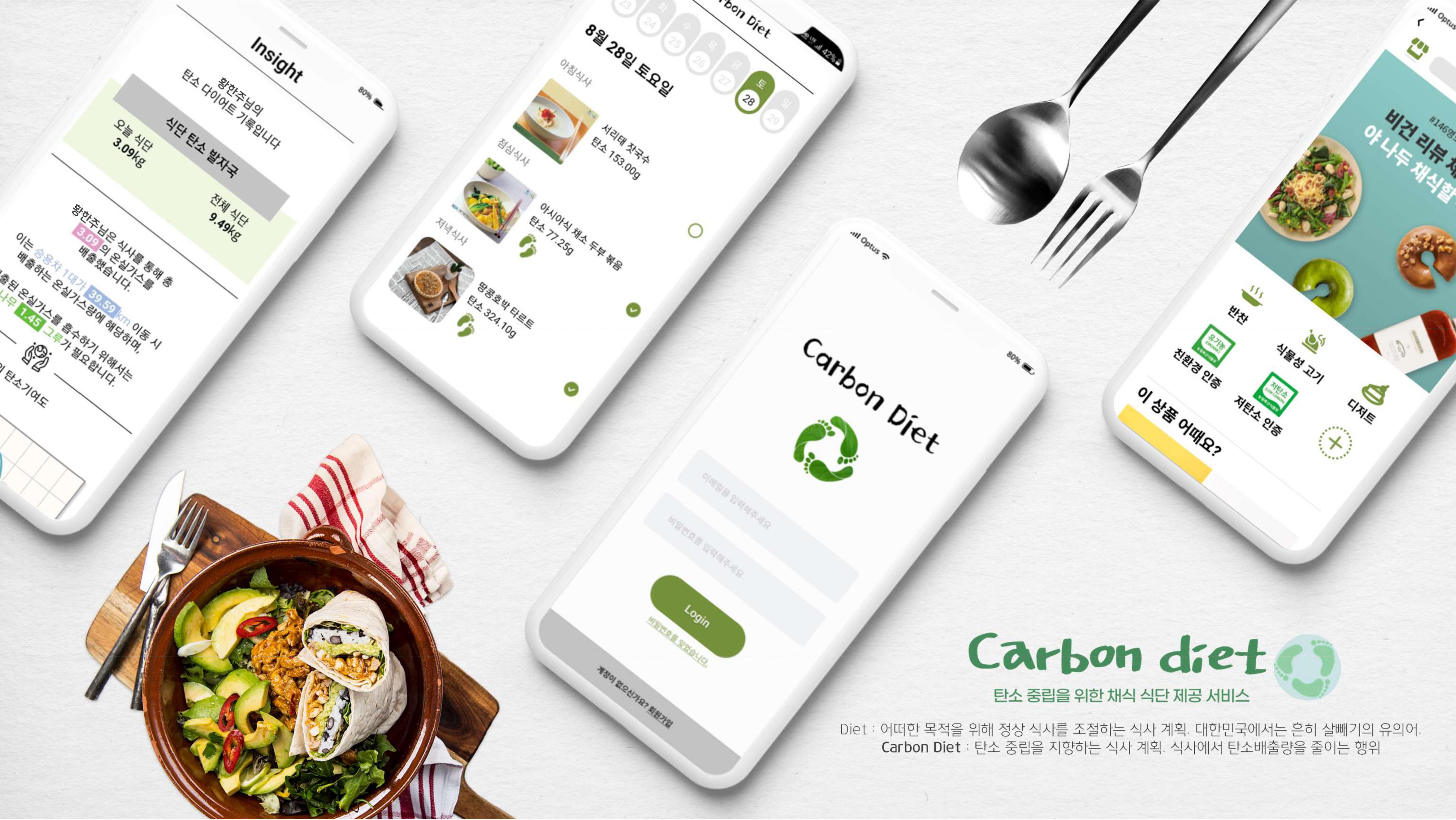 "Carbon Diet"는 탄소 중립을 위해 채식을 시작하는 이들에게 다양한 채식 식단 정보를 제공하고 사용자의 탄소기여도를 확인할 수 있도록 기획된 안드로이드 하이브리드앱입니다. 사용자는 자신이 도전하고자 하는 채식 수준과 채식빈도를 설정하고 앱으로부터 해당 설정에 맞춰 일주일 단위로 채식 메뉴들을 제공받습니다. 그리고 해당 서비스의 기반을 위해 채식주의 경향에 따른 식품 자동분류 모델 구현하였습니다.