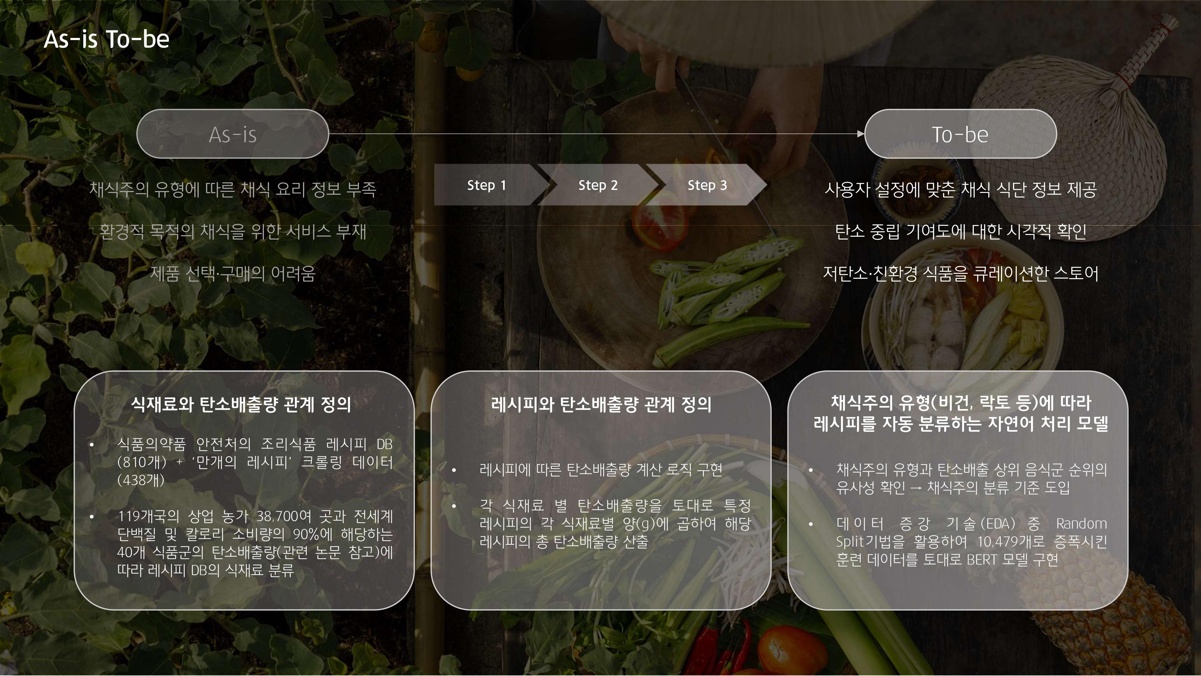 - Deep Learning : BERT, PyTorch (계속적으로 추가되는 레시피 데이터에 대해 채식수준을 자동으로 분류할 수 있도록 모델 구현)