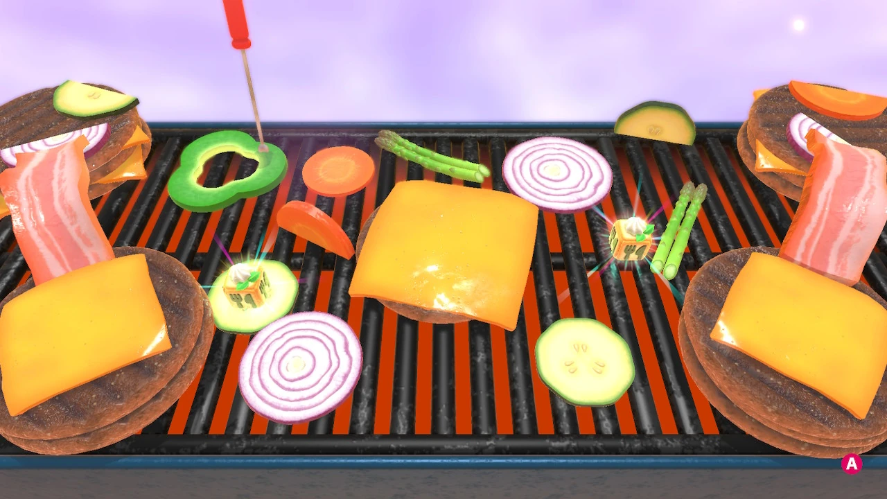 BBQ is a large, rectangular barbecue grill with a blue rim. It appears to be on at low heat, as a red hue can be seen between the slats. The surface of the grill is covered in food: hamburger patties topped with cheese slices and/or bacon strips; slices of onion, cucumber, carrot, and bell pepper; wieners; and asparagus spears. Skewers are sometimes positioned sticking into a vegetable slice or multiple food items.