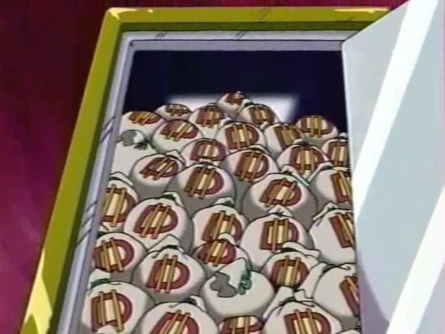 While usually a miser, Escargoon liberally hands out individual notes, handfuls, or even whole stacks of them to bribe Cappies to let them have their way with things. Judging from the Cappies' reactions, even a single D-bill can be worth quite a bit, which suggests that different denominations are printed since stacks of 1,000 D-bills are used to buy just stickers. Certain decorative jewelry aside, the "Gold" currency from The Great Cave Offensive in Kirby Super Star and Kirby Super Star Ultra is never given any mention in the anime whatsoever.