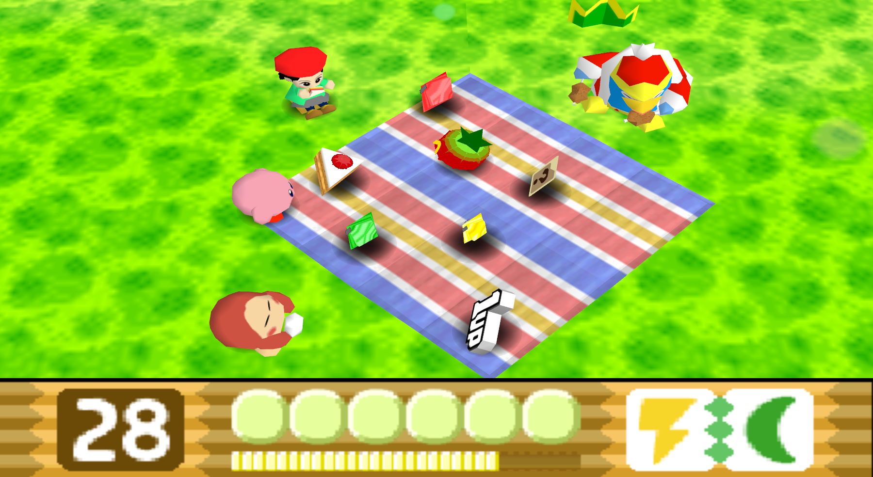 After the completion of each non-boss stage, the Goal Game starts. It consists of a picnic mat in a location which changes depending on the level just completed, with assorted food, stars, an Info Card, a Maxim Tomato, and a 1UP.