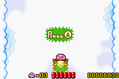 At the end of each stage (excluding boss stages), Kirby will appear and fall onto a sparkling, star-decorated platform (a cloud in the remake). The player is directed to press A, and depending on the timing of the press, Kirby will bounce up to a platform with a number on it (7 being the worst, 1 being the best). Kirby will then do his signature dance and a 2nd Kirby will hold up a sign with a number of points. If the player lands on a 7, the sign will remind the player to press A. If the player reaches a 1, a UFO will give the player a 1UP. The goal is to press A when the platform reaches the furthest downward point.