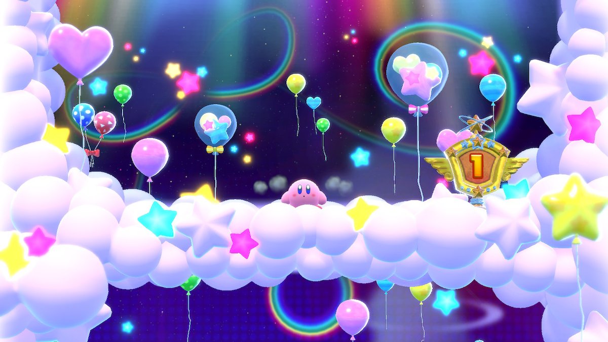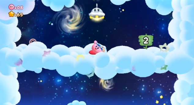 Similarly to Kirby's Adventure/Kirby: Nightmare in Dream Land and Kirby's Return to Dream Land, if Kirby lands on the clouds in the order from seven to one consecutively each time the game is played, a UFO appears and rewards him with 30 1UPs. He also gets a Maxim Tomato and a sticker.
