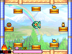 Kirby starts off in a regular rotating Cannon, with either food, 1UP or nothing on eight platforms around it. The speed of rotation is randomized at the end of each level. Firing Kirby towards the platform nets whichever item Kirby flies through.
