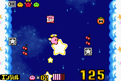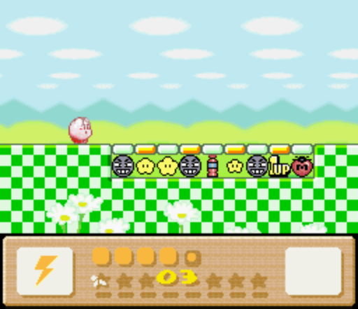Kirby flies through an area on the Warp Star filled with 1UPs and various types of food. The goal is to collect what is desired while avoiding obstructions in the form of Heave-Ho Blocks before time runs out. If one of the blocks is hit, control will be lost for about a second, although Kirby takes no damage.