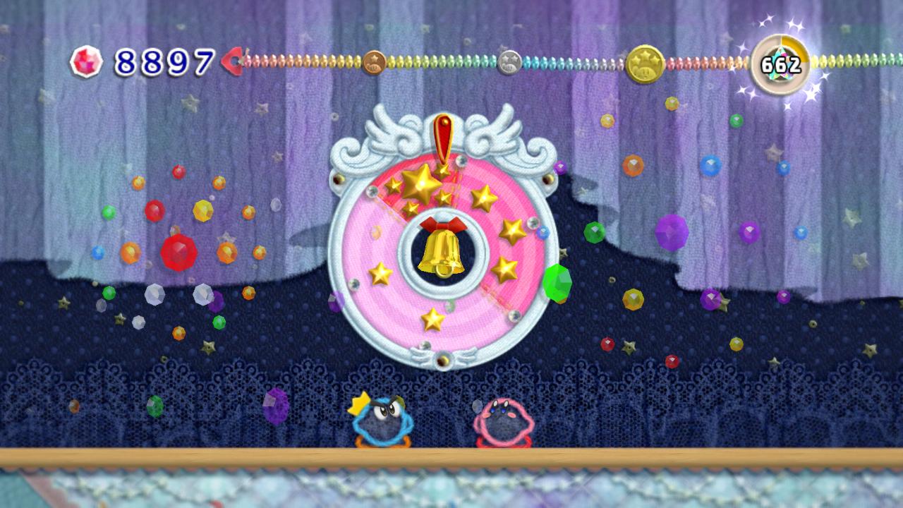 When Kirby finishes a level, a wheel with a bell in the center will appear. Hitting the bell with the yarn whip will make it spin slower and slower; whichever portion the pointer lands on, the player gets as many beads multiplied by 100.
