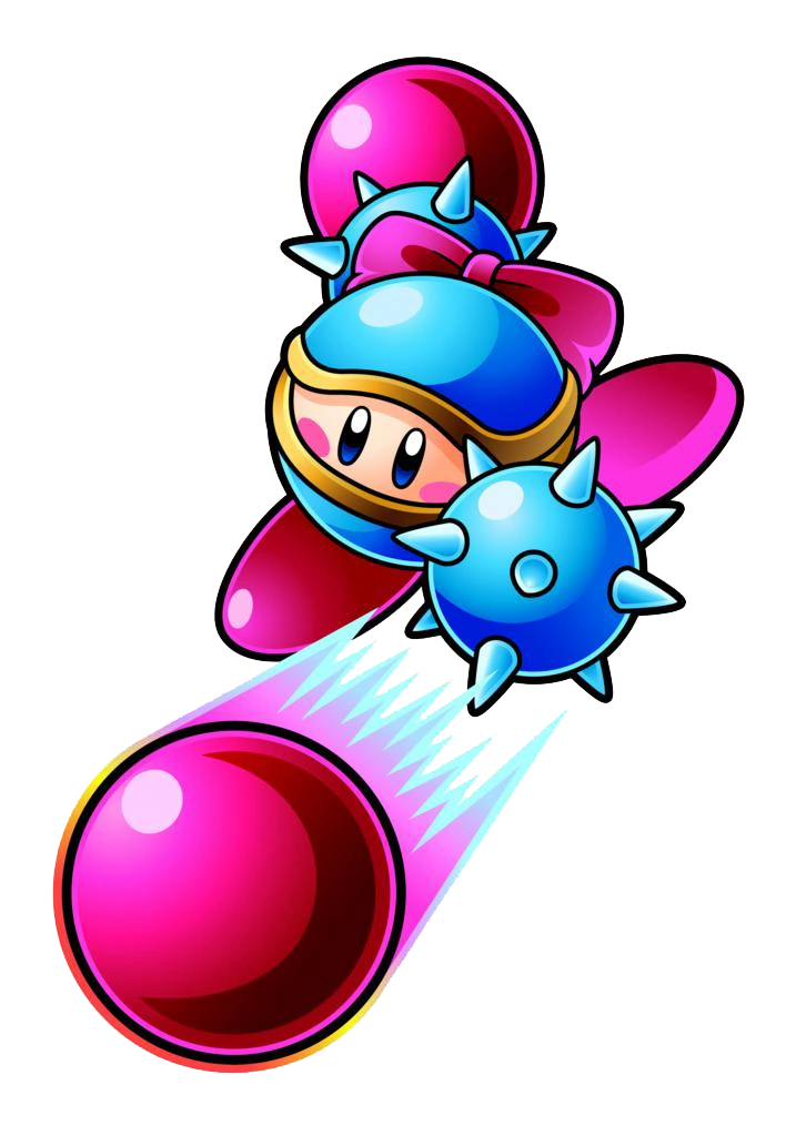 Iron Mam attacks by using the two fist-like balls at her sides. She gives the Fighter ability when swallowed. Sometimes, she'll jump and make a star at her front which Kirby can inhale (though the star only appears in the remake).