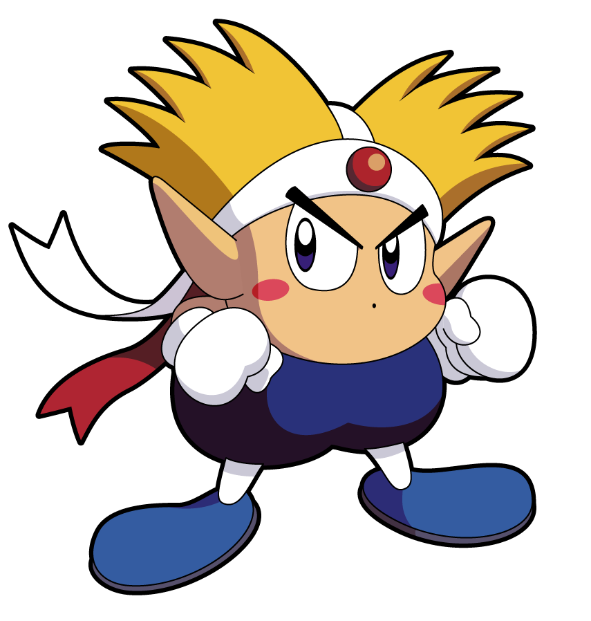 Knuckle Joe is a small humanoid creature with pointy ears, spiky yellow hair, and eyes similar to those of Kirby. Knuckle Joe wears a blue jumpsuit, white gloves, blue shoes, and a white headband with a red jewel set in it. He is also shown to have two small red shoulder pads, although these are not present in all of Knuckle Joe's appearances. When he becomes a Helper in Kirby Star Allies, his headband changes to a red headband that is the same for when Kirby is granted the Copy Ability.