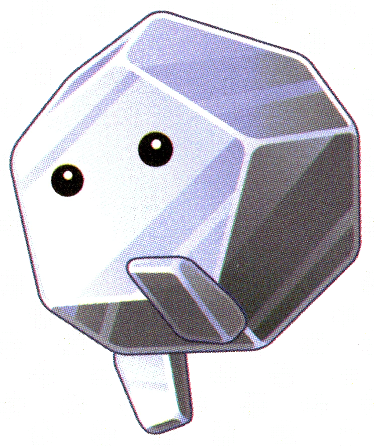 Metalun appears to be a silvery metal creature, about twice Kirby's size, that is shaped like a dodecahedron. It has two small, black eyes on one face of its body, but no torso, ears, nose, or visible mouth. It also has two blocky feet which it tucks in as it rolls.