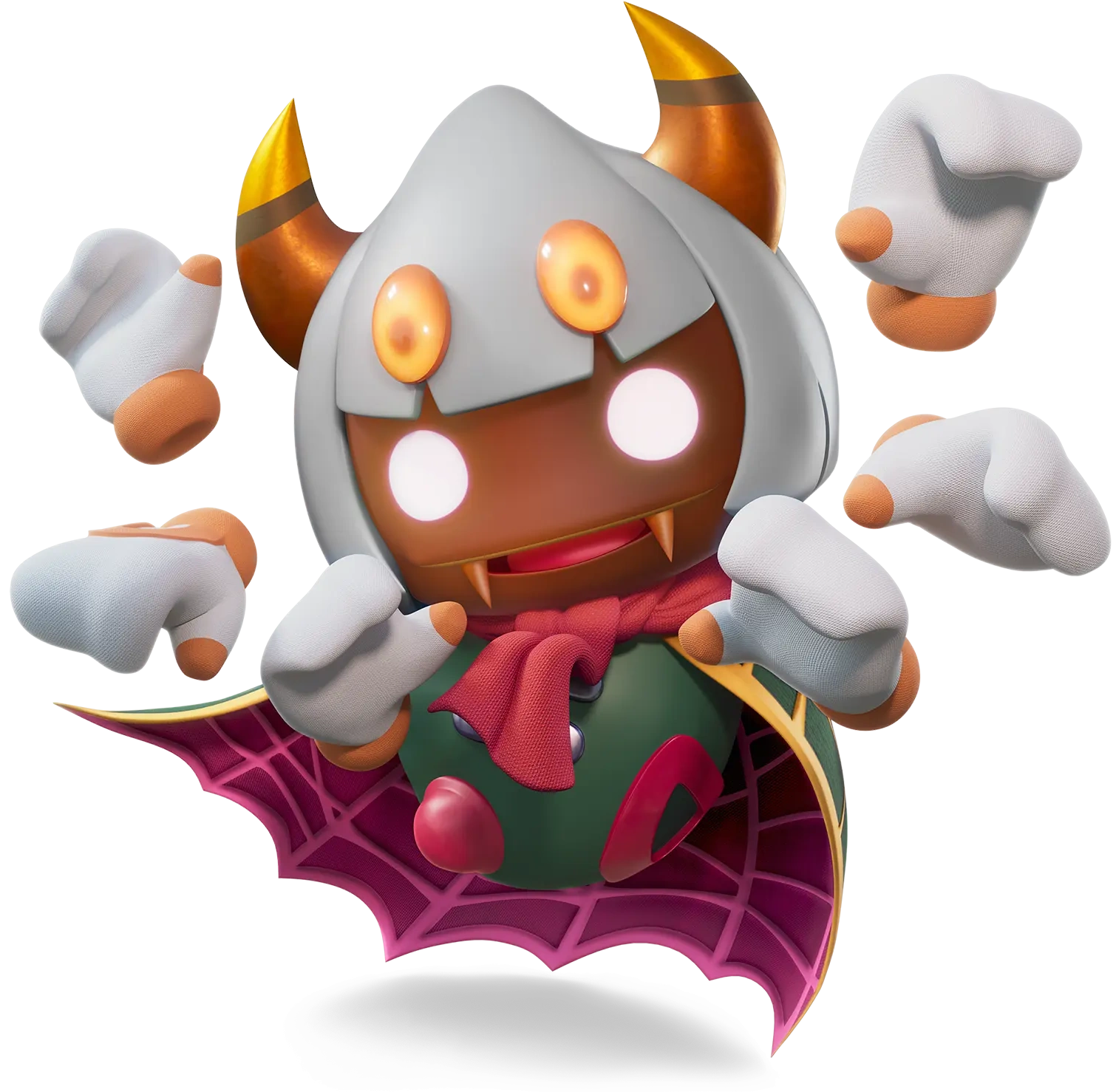 Taranza is an androgynous, young, spider-like creature. He has brown skin and two orange horns with brown rings and yellow tips, as well as shiny, silver, curvy hair; additionally, he has two orange fangs protruding from his upper lip, which is lined in white. On the front of his head, Taranza has two orange-yellow eyes in his hair and two white eyes with a slight purple glow on his face, along with four more orange-yellow eyes on the back of his head. He wears a crimson scarf and a jagged, dark green cape with orange lining in a spider-web pattern. The dark green clothing on his body has two silver buttons on its front and crimson circle designs on both sides. Taranza also has a crimson stinger-like appendage on his bottom and six disembodied hands with white and orange gloves.