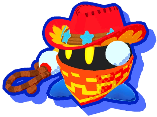 Wester is a black, orb-like being with yellow eyes, blue feet, and white hands. He wears an orange bandana with a yellow pattern across his face (which covers the lower half of his body) and a red cowboy hat with a blue bond on his head. Wester wields a whip similar to Whip Kirby's. As a Helper in Kirby Star Allies, Wester wears the hat Kirby wears when he gets the Whip Copy Ability.