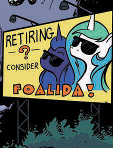 In My Little Pony: Legends of Magic Issue #1, a young Princess Luna opens a portal to another dimension and gets abducted by its inhabitants. In the Legends of Magic Annual 2018 comic, both Celestia and Luna are captured and taken back to the same world, which is revealed to be an alternate Equestria ruled by the Pony of Shadows. My Little Pony: Nightmare Knights later features this alternate dimension as home to an interdimensional casino, which is run by Princess Eris. According to Jeremy Whitley, this world and Equestria (Reflections storyline) are separate.[25]