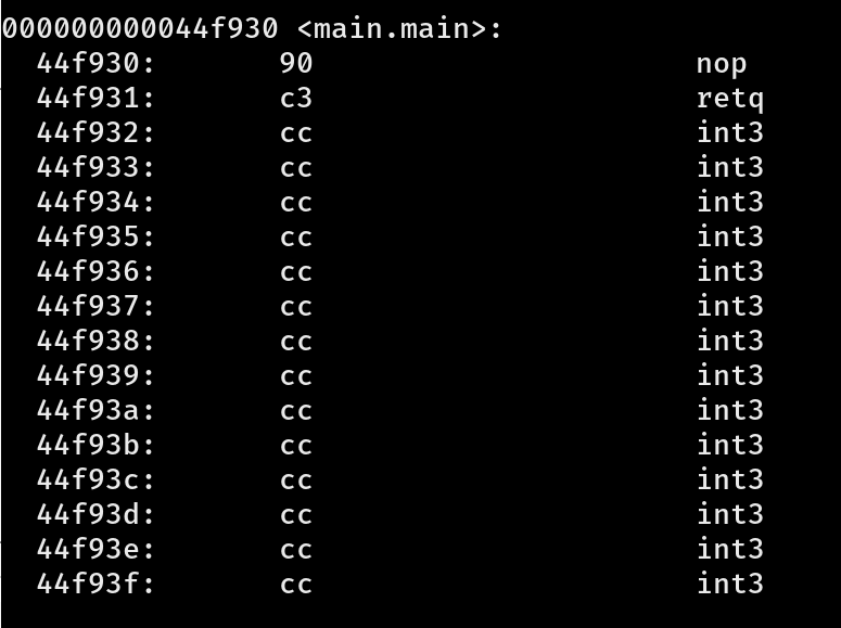 为了根据地址查找必要的函数,我们需要知道 PC (程序计数器)。你可以在 EIP 寄存器中找到 PC 值,它由 DW_AT_low_pc 和 DW_AT_high_pc 表示。举个例子,对于 `main.main` 函数(`main` 是 Go 运行时的函数)使用 `low_pc` ,并尝试使用 `objdump -d` 在二进制文件的位置 `0x44f930` 找到它。