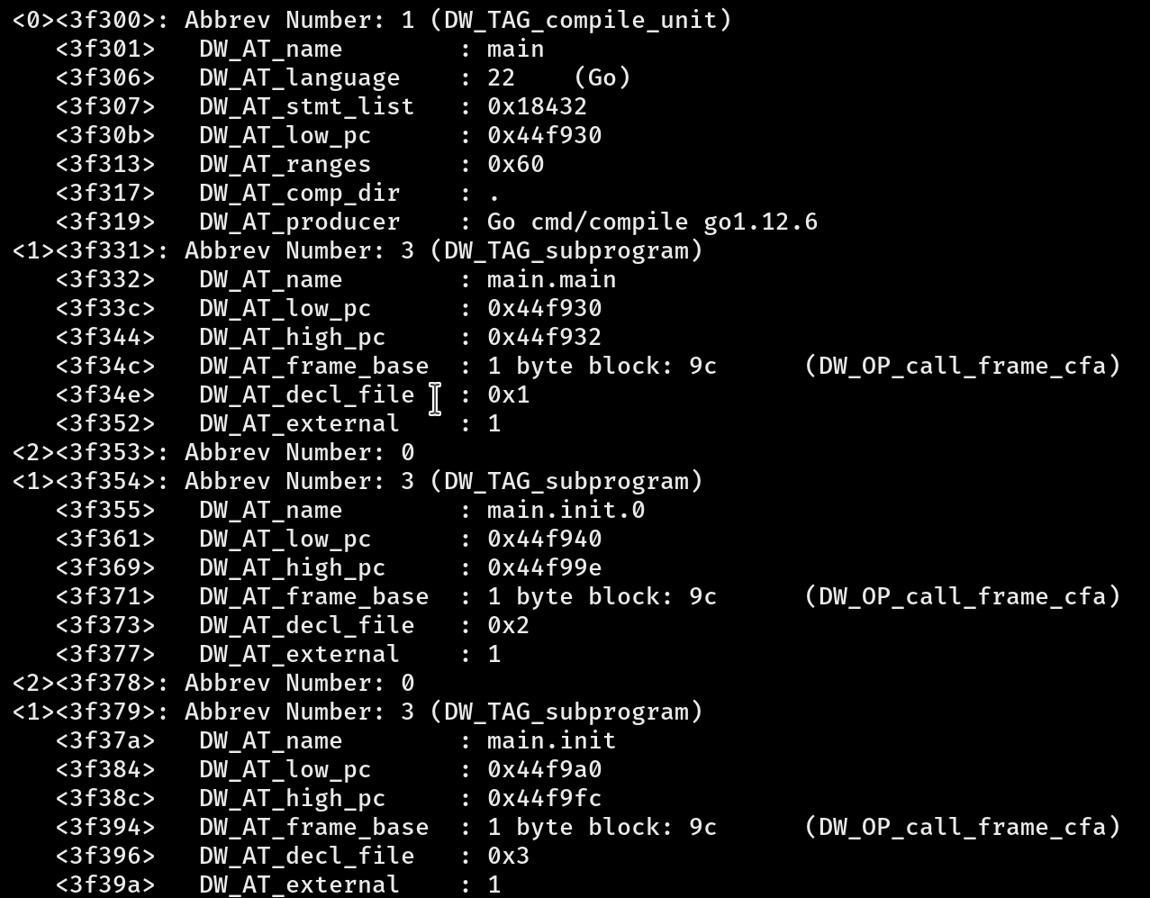 在我们仔细查看 `-w` 标志并拆解二进制代码以检查 DWARF 符号表是否消失之前,我建议先明确 DWARF 符号表的定义。
