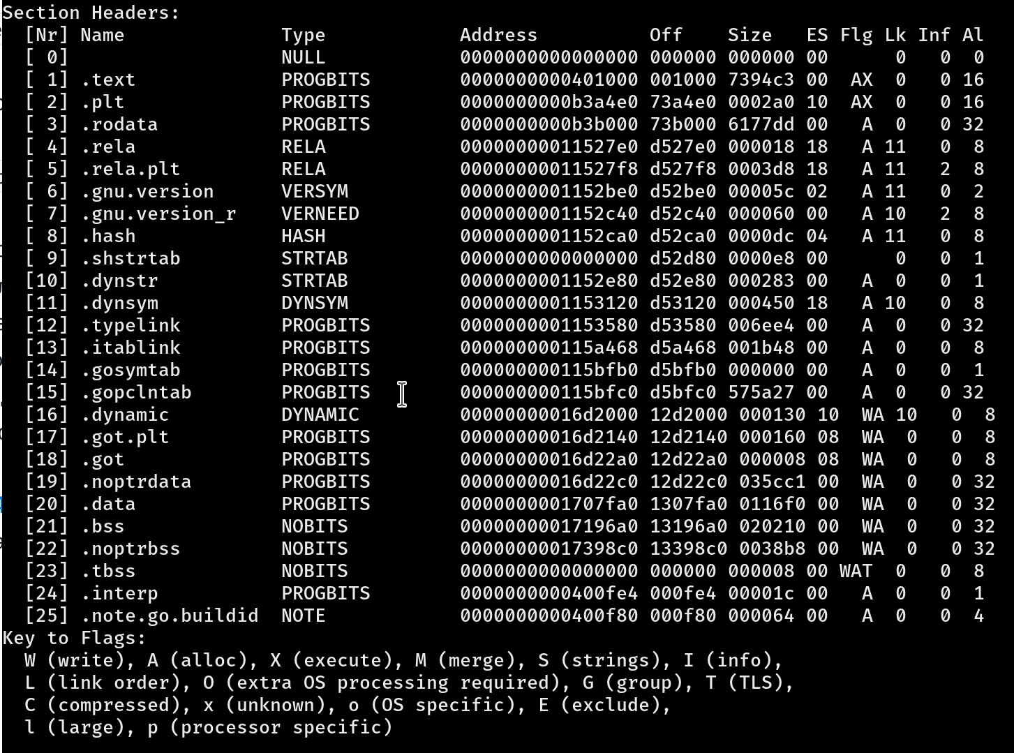 正如我们看到的,`.zdebug` 部分完全消失了。通过对顶部低位(Off 列)地址相减,我们可以精确计算二进制文件减小了多少。当你把这个差值从 Bytes 转换到 KB 时,可以对实际情况有更直观的体会。