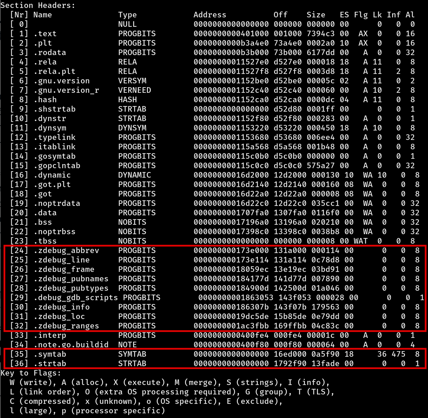 我们可以看到这个二进制文件中包含了用于调试的数据(从第 24 节到第 32 节),并且还有一个符号表和字符串表。(如下所述)