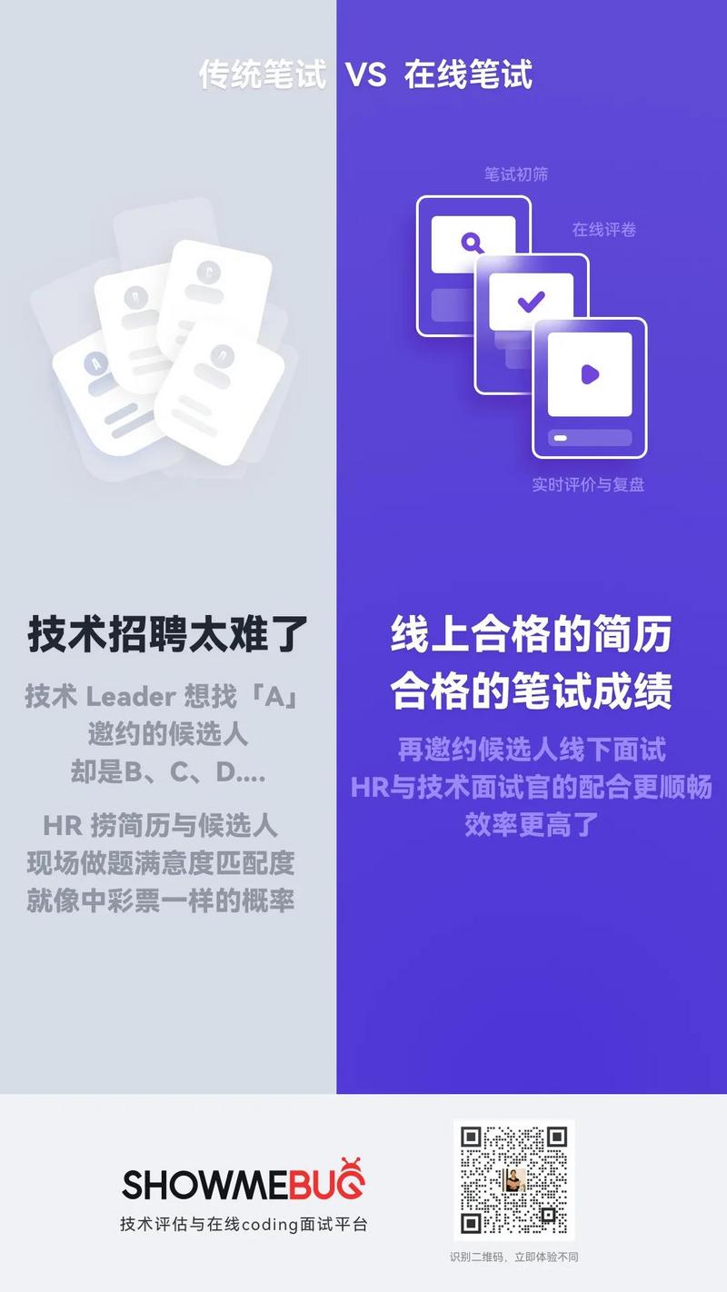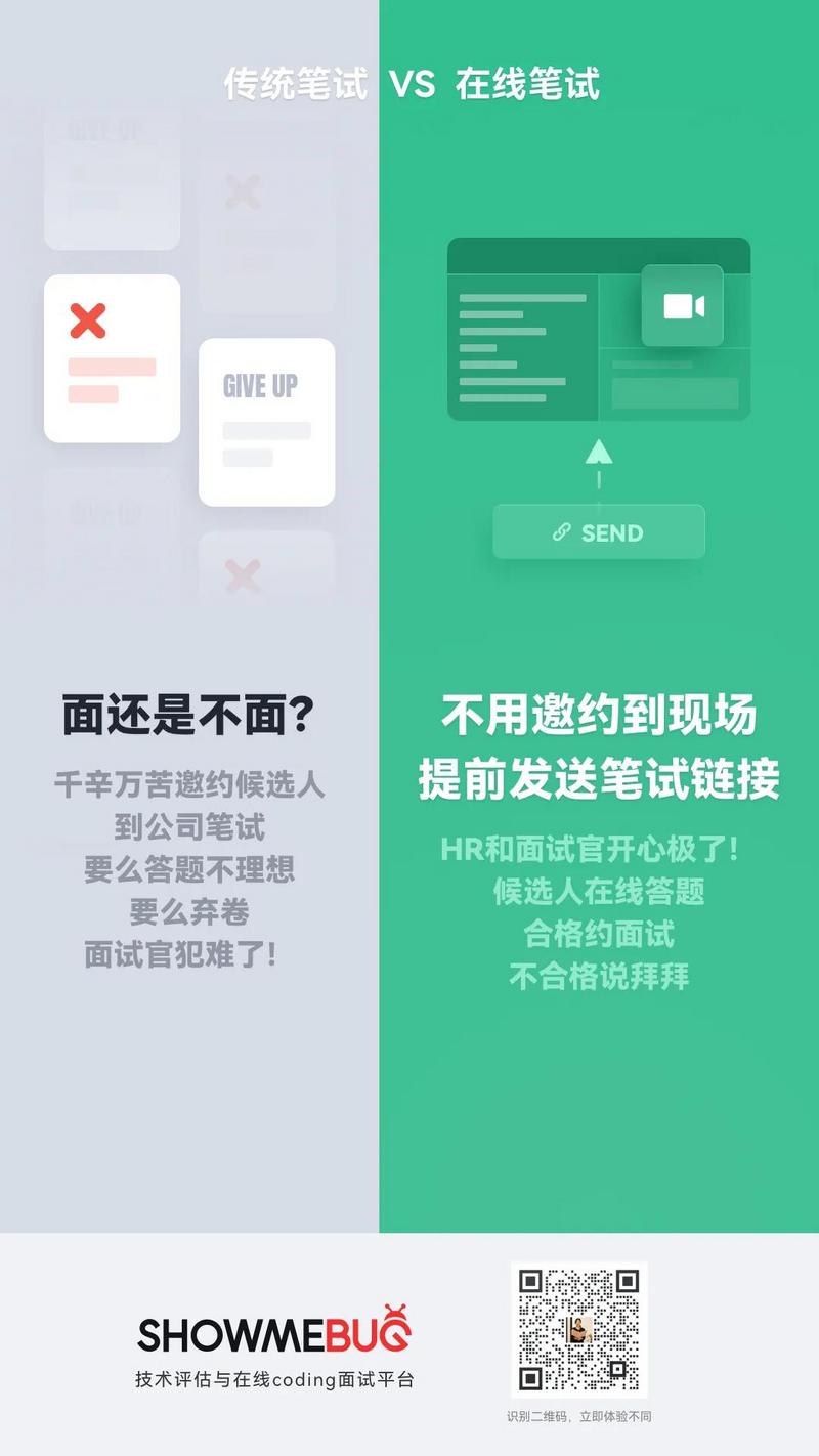 [ShowMeBug](https://www.showmebug.com) 作为专业的技术评估平台,已经给 6000 家高科技企业提供在线笔面试服务,真正用数字化赋能企业的技术招聘。