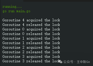 fmt.Printf("Goroutine %d acquired the lock\n", id)