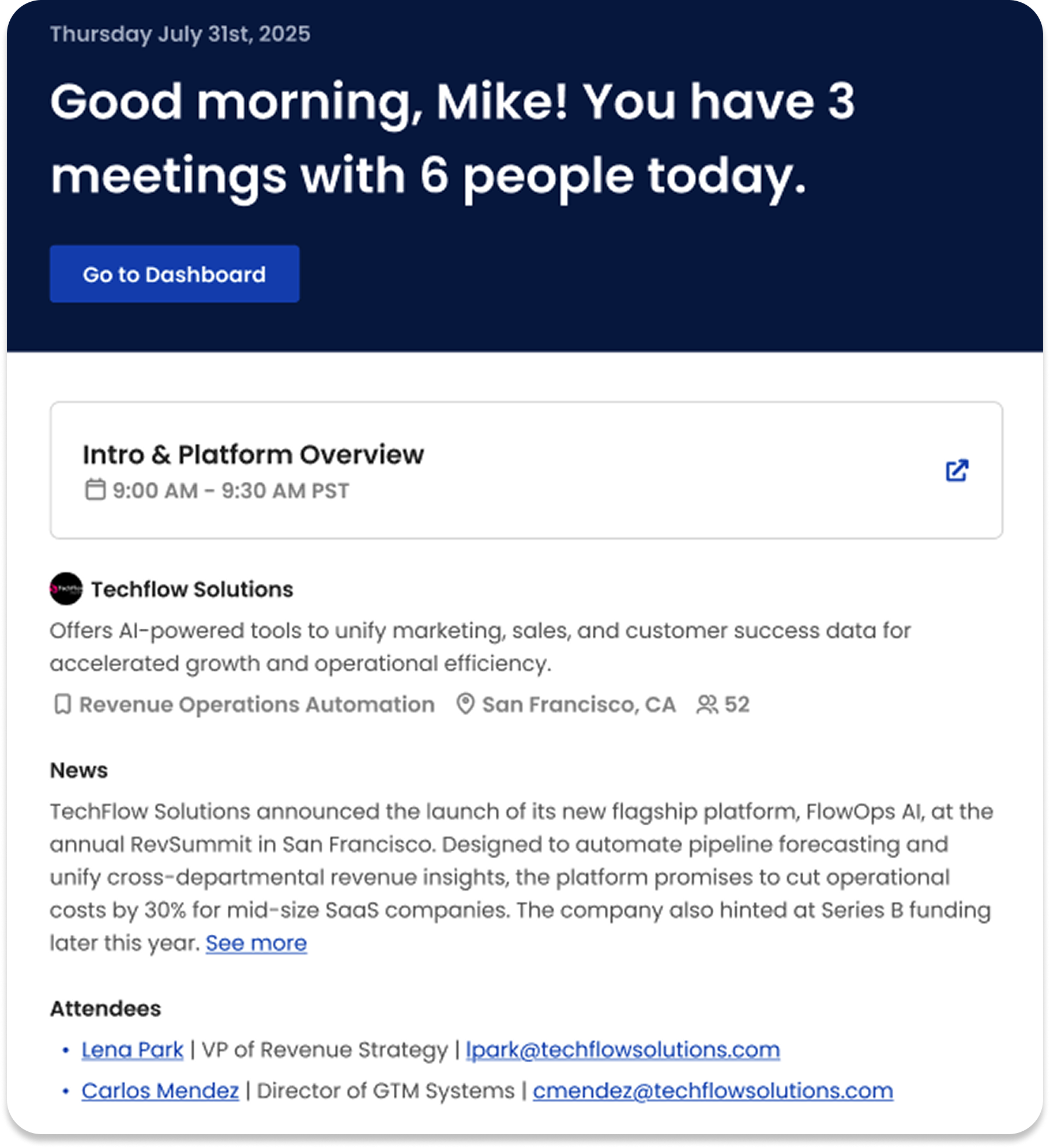 Meeting AI automates prospect and customer research to ensure you are prepared and can spend time having high-value interactions that drive closed deals.