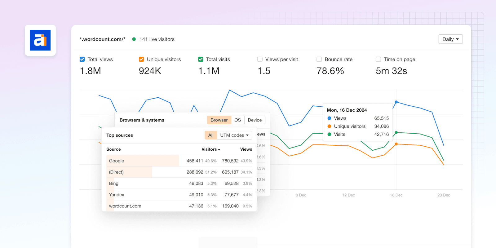 Ahrefs Web Analytics is a privacy-friendly analytics platform that provides you with a simple and free solution to track and report your published sites’ traffic. No cookies by default — just the metrics you need.