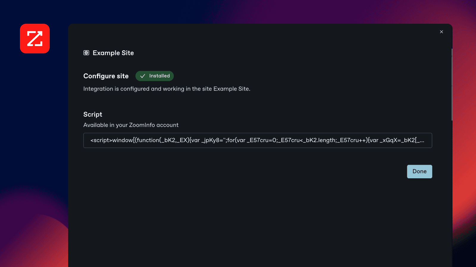 The integration injects the ZoomInfo script on your page, using the script you provide during configuration, so that you can get analytics information from your GitBook site directly inside of ZoomInfo.