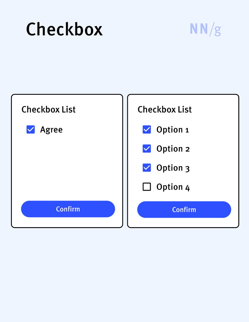 An input control that can appear either by itself or in a list of checkboxes. By itself, a checkbox allows users to select between two states: checked and unchecked. A list of checkboxes is used to select a subset of items from a list. In a list of checkboxes, each box can be selected independently, meaning that selecting one box does not affect the state of the others in the list.