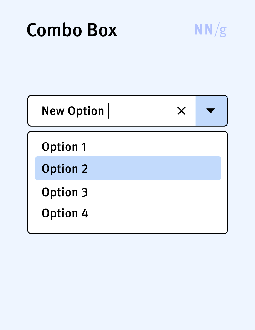 An input control that combines the features of a dropdown list and a textbox, allowing users to either select an item from a predefined list or enter a custom value. It consists of a textbox where the user can type an input and an arrow button that, when clicked, displays a list of options. Users can select an option from the list, which then appears in the textbox, or they can type directly into the text field. Combo boxes are useful when users need the flexibility to choose from a list or input a unique entry not provided in the list.