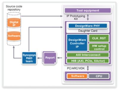 The Synopsys team used DesignWare IP Prototyping Kits as the platform to test their new automation process and the core platform to deploy the automation engine. The kits center around a complete, out-of-the-box reference design that consists of a validated IP configuration and necessary SoC integration logic such as clock, reset, power management, and test logic for a specific IP protocol, implemented on Synopsys' HAPS-DX physical prototyping system. The kits are an ideal platform for the Synopsys team to learn how to create and follow basic principles in IP testing and validation projects: