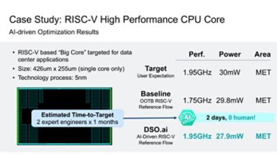 In one example of an energy-efficient processor design, a Synopsys DSO.ai-driven reference flow delivered surprising results for a RISC-V-based high-performance CPU core targeted for use in data centers. Using 5nm process technology with a starting point of 1.75GHz at 29.8mW of power, the target was 1.95GHz at 30mW. The estimated timeline for two expert engineers was a month. Synopsys’ AI-driven reference flow achieved 1.95GHz at 27.9mW within just two days, also hitting the expected area target.