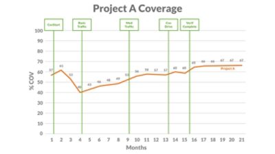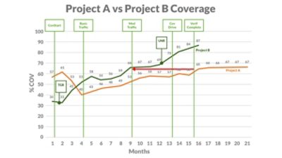 Excluding the unreachable coverage targets boosts total coverage by eliminating apparent coverage holes that are actually unreachable and by reducing the total number of coverage targets to be hit in simulation. This is a completely automated process. The FCA app generates an exclusions file with the specific unreachable coverage points for each unique instance in the design. As shown in the following graph, the combination of test grading and unreachability analysis on Project B achieved a major "shift left" in coverage by two key milestones.