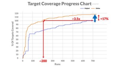 As shown in the graph below, applying ICO, VSO.ai, and unreachability analysis achieved 17% more coverage in the same number of runs with a 3.5x compression of regression tests compared to the baseline. Four unique bugs were also uncovered.