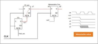 As with clock gating, reset mechanisms have a functional behavior that must be functionally verified. This is a traditional verification, or system validation, problem that can be solved with traditional verification strategies, both dynamic and static. Metastability induced from asynchronous resets is another class of design flaw that can lead to a total chip failure, with all the associated costs of re-spinning a modern multi-billion gate ASIC! It’s a class of problem that you can rarely work around in software. This risk is exacerbated by the ever-increasing complexity of resets. A portion of the chip with a unique reset signal is called a reset domain, and a signal traveling from one reset domain to another creates an RDC. RDCs can be susceptible to metastability, and this can even occur within a single clock domain as illustrated below.