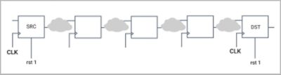 A unique challenge for resets arises from the sequential nature of resets where there can be many reset-less elements in a data path pipeline as shown below.