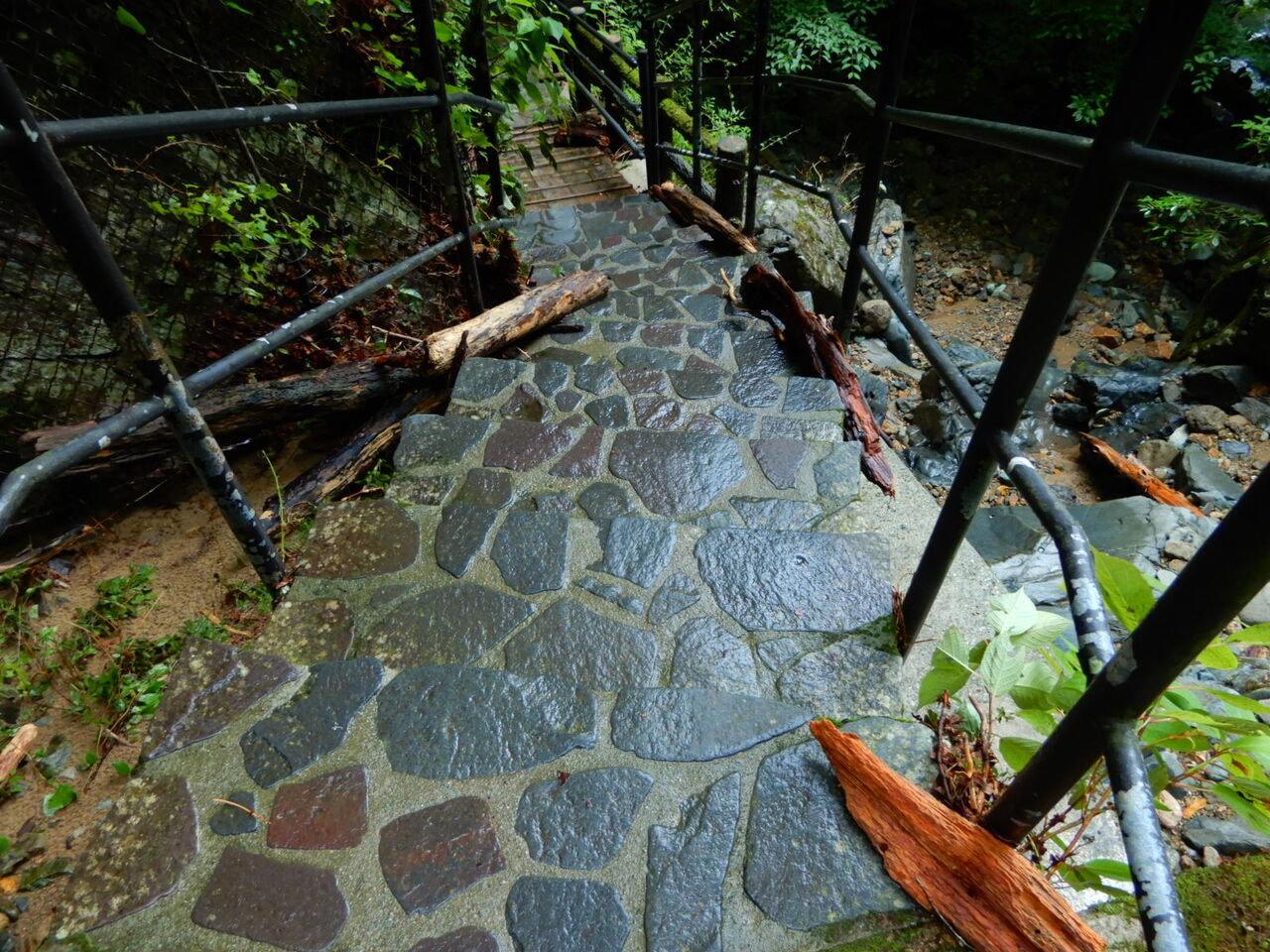 堤頂の上が鬼怒川渓谷龍王峡の遊歩道であり、