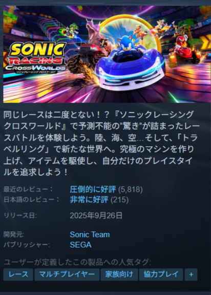 B0FSQ3D22P [Steam] ソニックレーシング クロスワールド|オンラインコード版