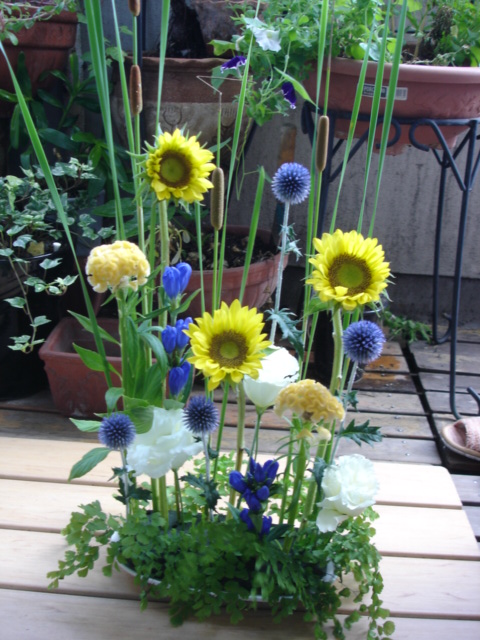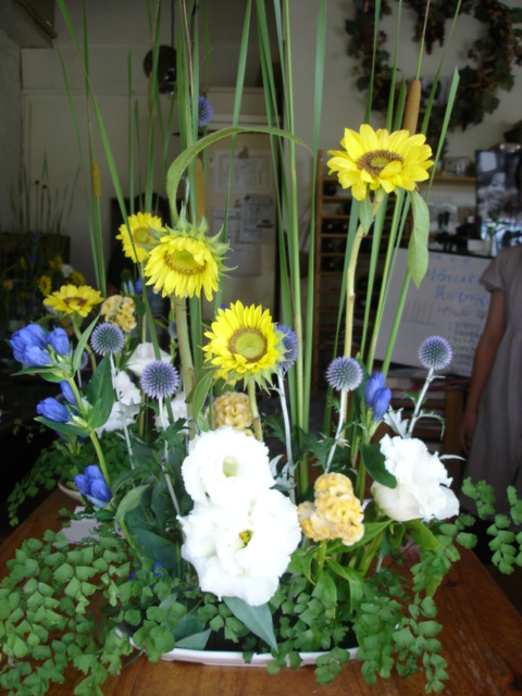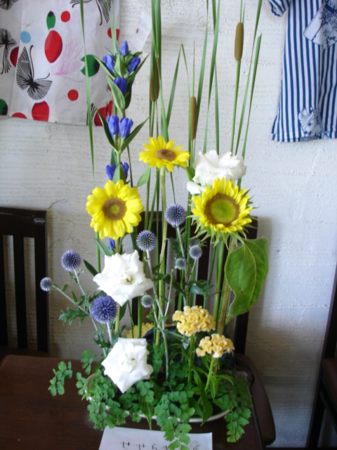 ひまわりの葉っぱがしずくみたいだったので、ヒメガマノホは滝をイメージ、ルリタマアザミで水しぶきを表現し、作品のテーマを「夏のせせらぎ」としましたとさえちゃん。