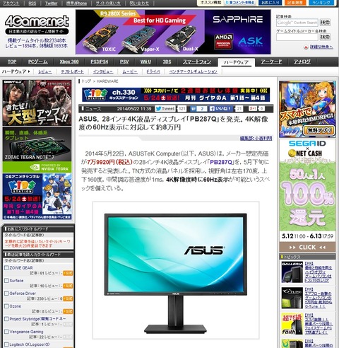 2014年5月22日,ASUSTeK Computer(以下,ASUS)は,メーカー想定売価が7万9920円(税込)の28インチ4K液晶ディスプレイ「PB287Q」を,5月下旬に発売すると発表した。