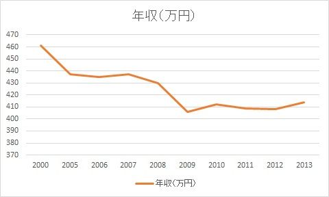 上の表はサラリーマンの年収の推移、2000年には460万円を超えていたのが2009年のリーマンショック後には420万円を割り込み1割以上減少しているのがわかります。そういった時代では「努力して年収を増やせばよい」と言っても全体の傾向を見ると不可能ではないにしても相当難しいのがわかります。