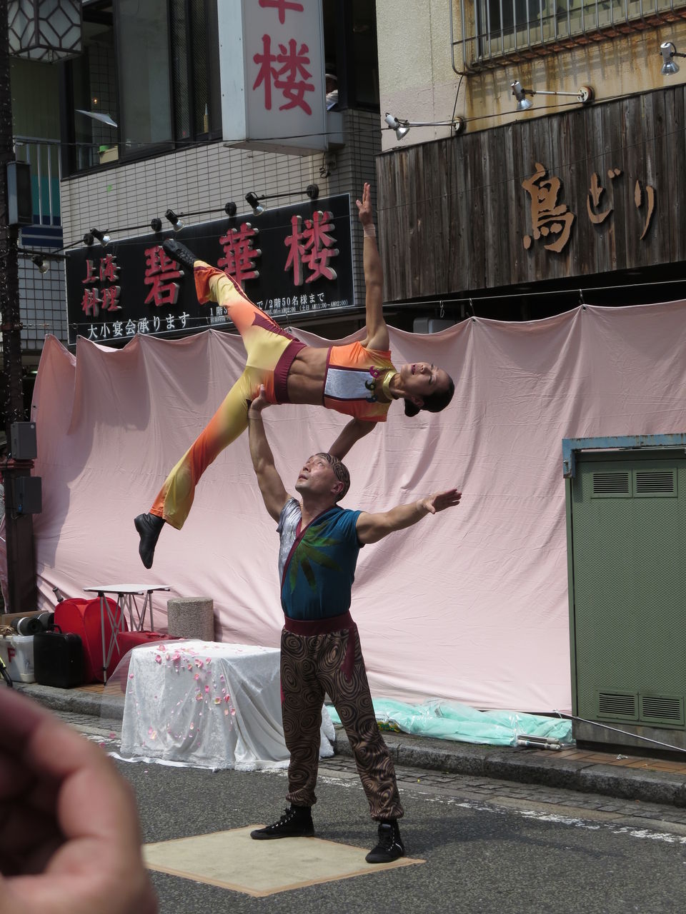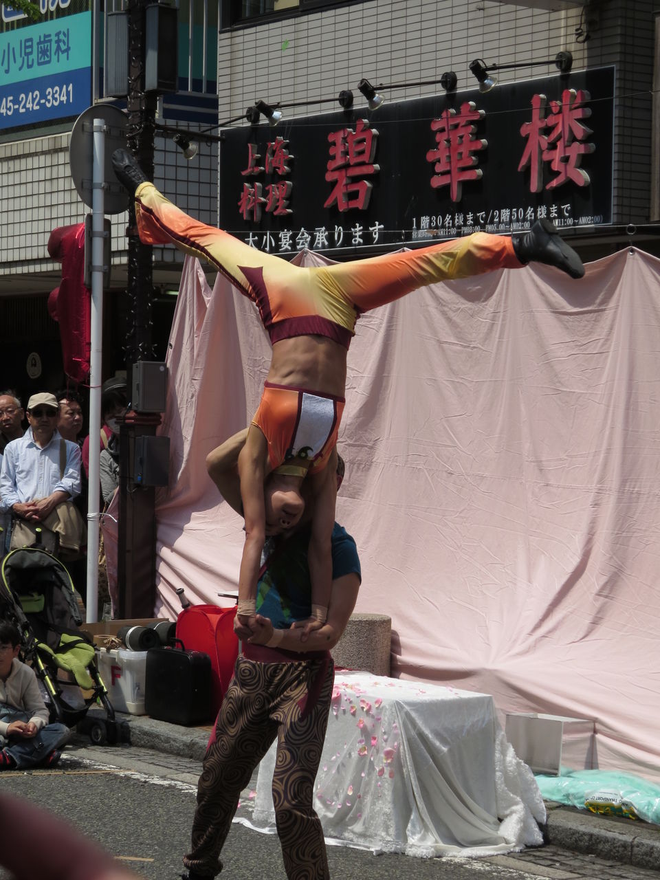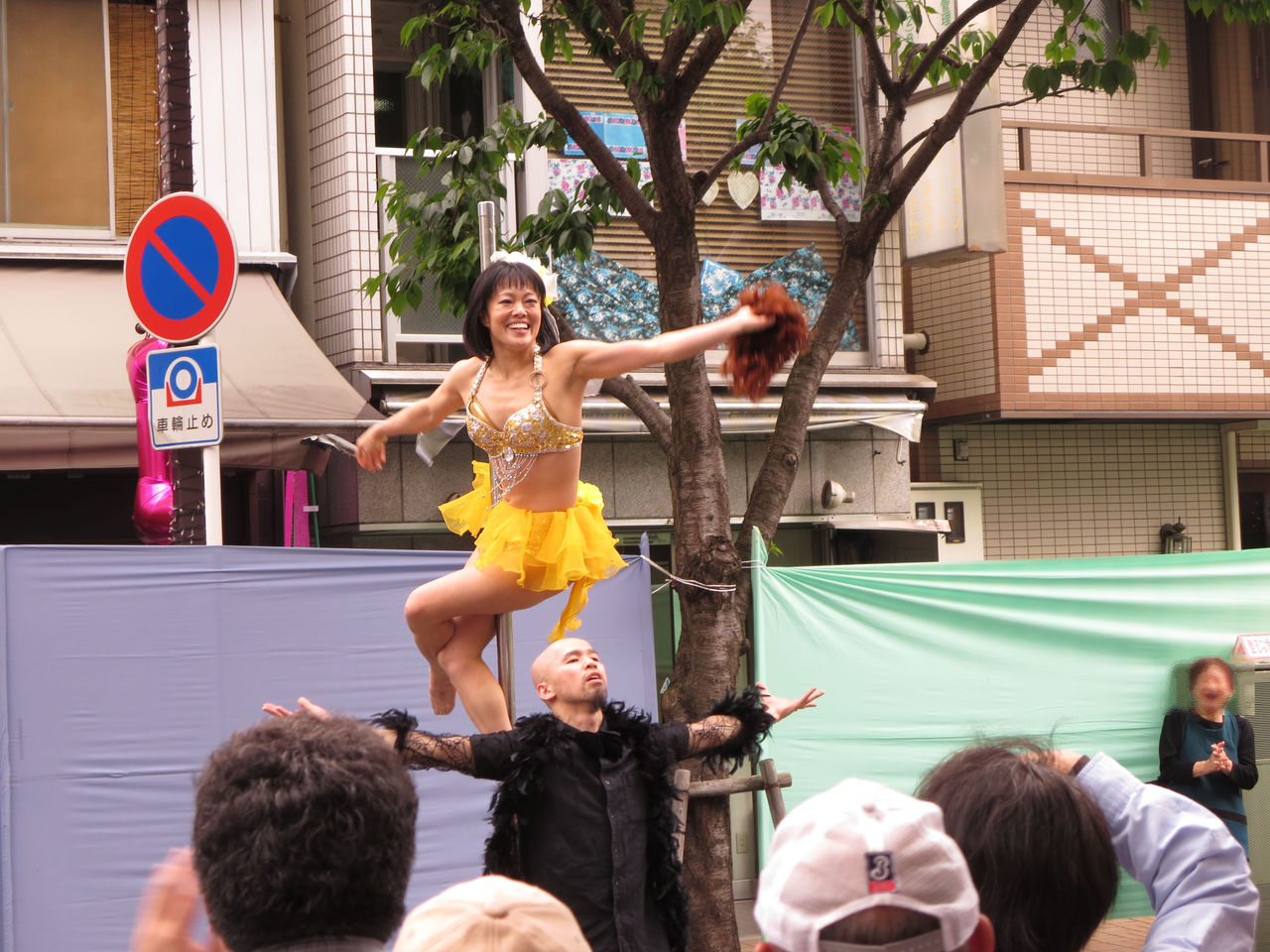 続いては東京うぐいす座のポールダンス、ポールダンスと言うときれいなおねぇさんがセクシーな衣装でと言ったイメージですが、こちらは男女のペア、セクシーさに欠ける分、回る回る、アクロバットに立体的に見せてくれます。セクシーさに欠けると言いつつ花火おねぇさんの華やかさも魅せてくれました。