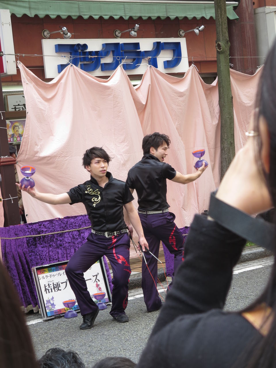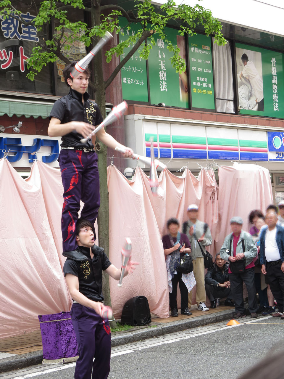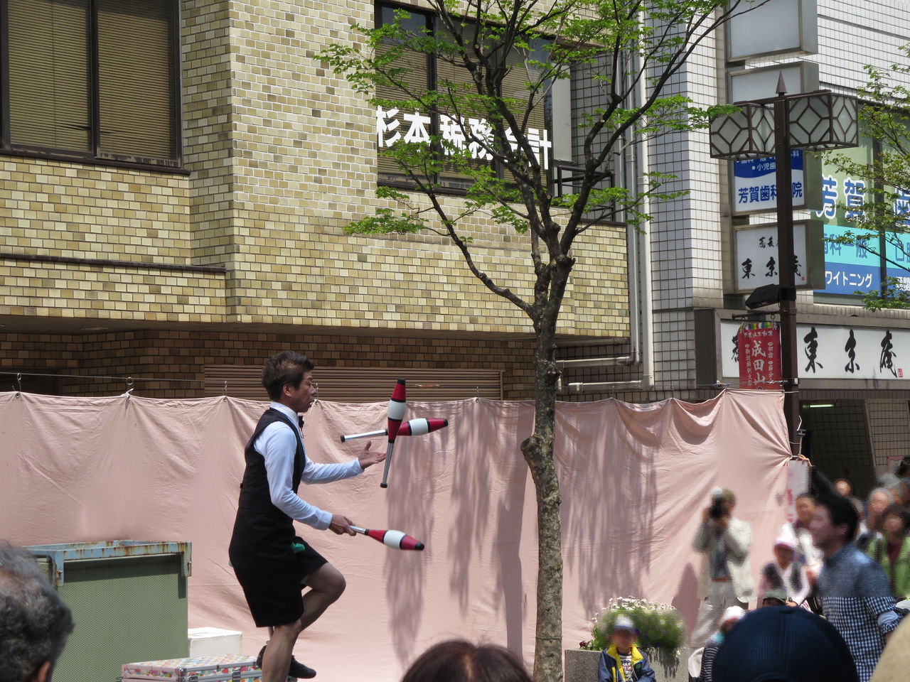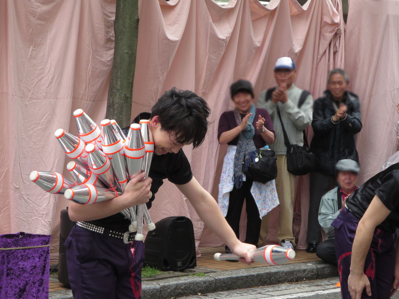 続いて本通りに戻って大道芸を見て回ります。こちらは三雲いおりによるジャグリングショー、ジャグリングはいくつかあったのですがこちらはベテランらしく笑いを誘う話術が印象的でした。